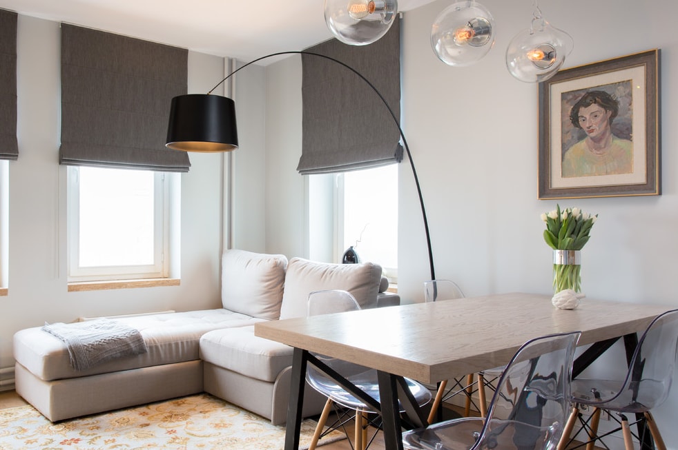 Баланс между классикой и минимализмом в современном стиле касается даже выбора текстиля. В кухонной зоне ограничься простыми однотонными роллетами вдоль окна – это практично, эффективно и безопасно. А вот в зоне гостиной хорошо смотрятся простые прямые шторы из плотной ткани на люверсах или петлях. Главное – без лишних воланов, кружев, кисточек, тесьмы и других декоративных излишеств.