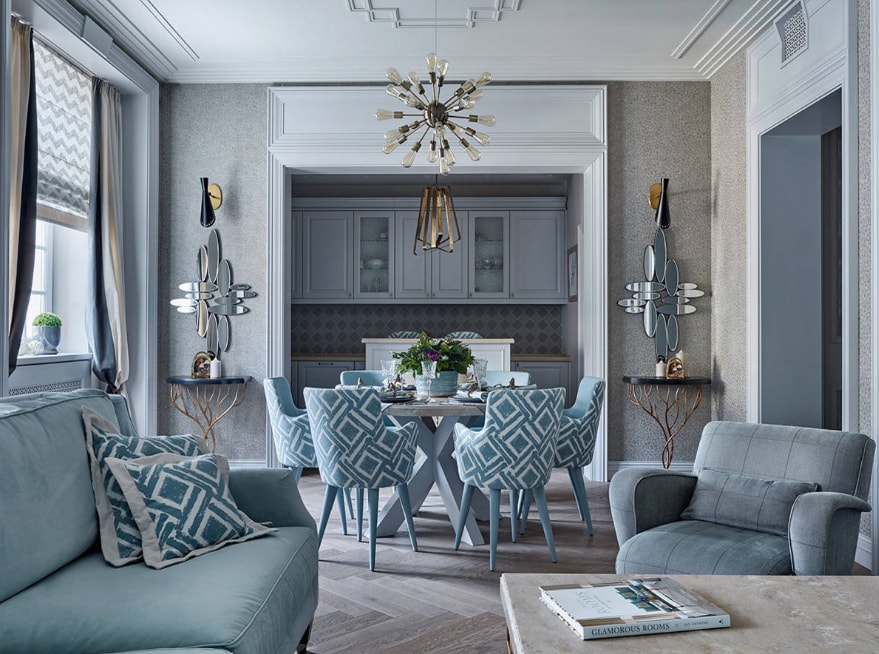 Потрясающий дизайн кухни-гостиной в одной цветовой гамме. А одинаковый узор как на стульях, так и на подушках делает его еще более стильным.