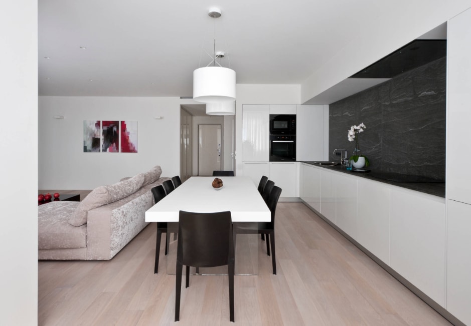 Минус только один – в кухонной зоне белизна быстро потеряет свою свежесть, поэтому будьте готовы к регулярному протиранию.