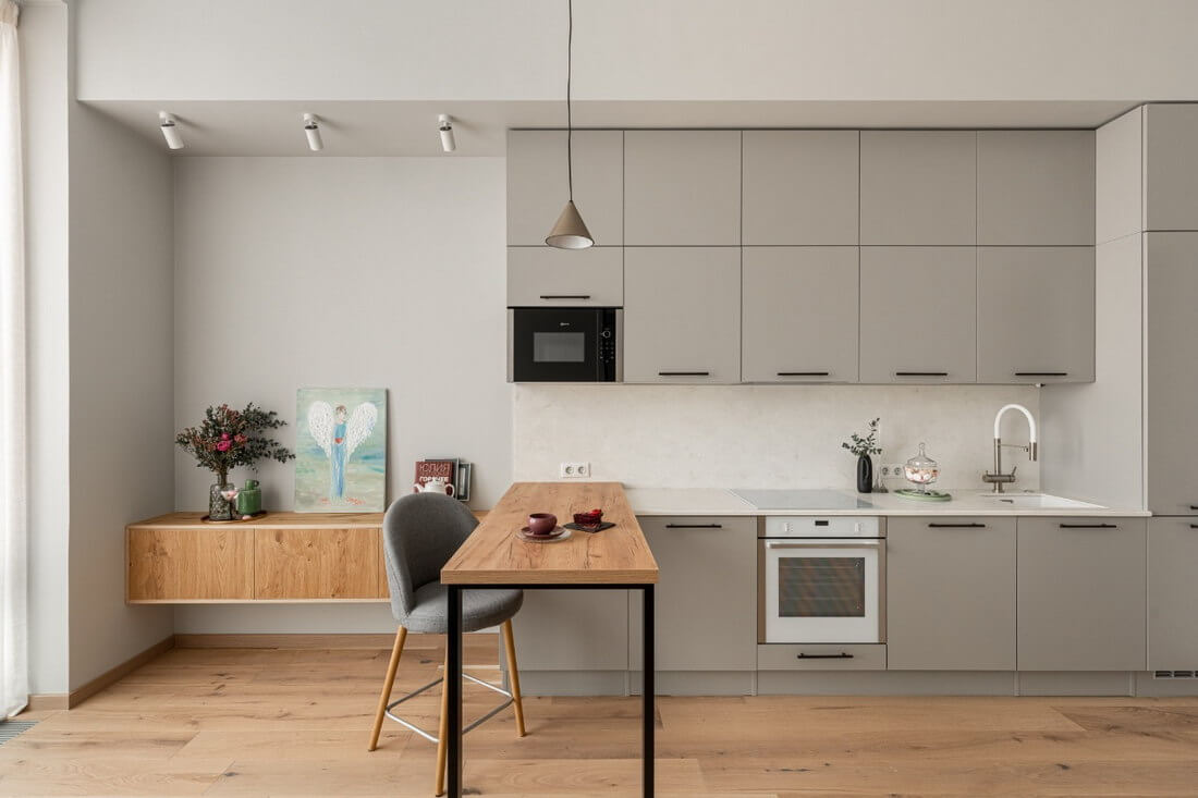Если Вы не хотите останавливаться на одном материале, можете попробовать комбинировать их в отделке пола, например, дерево и камень позволят разграничить зоны в комнате, совмещенной с кухней.