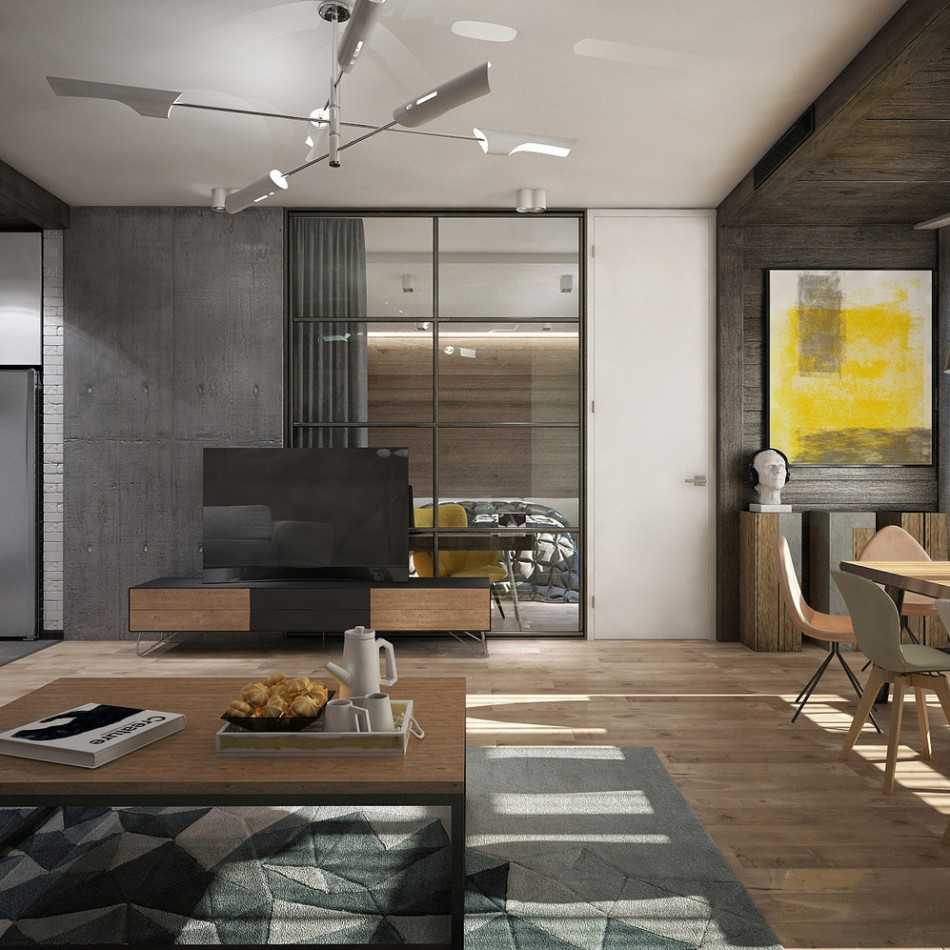 Урбанистический стиль лучше всего подойдет для студии. Потому что он позволяет гармонично совместить несовместимые элементы. Благодаря чему даже душевая посреди зала будет выглядеть ярким пятном, а не «бельмом на глазу».