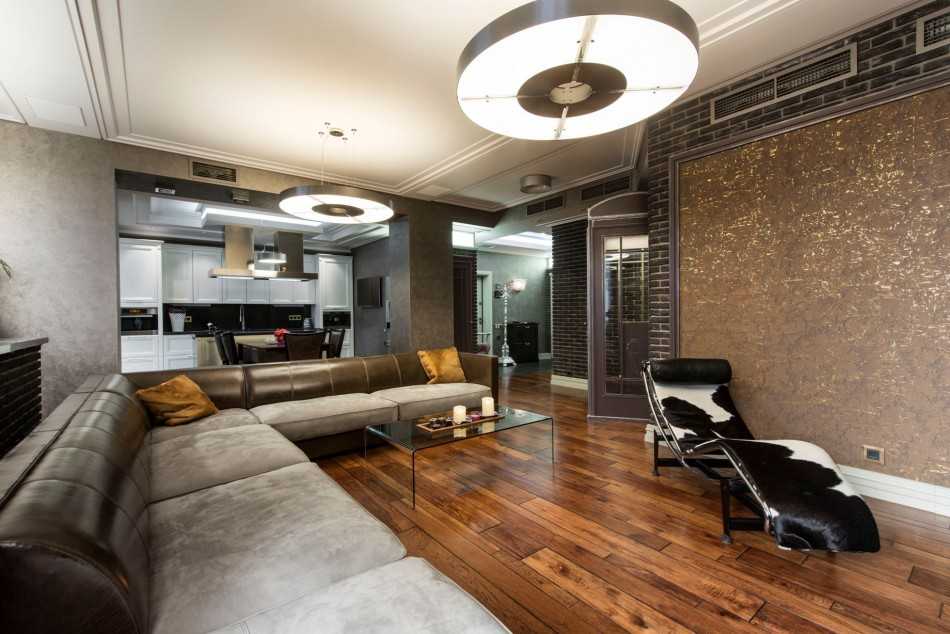 Иногда в гостиных присутствует старый деревянный пол, еще пригодный к эксплуатации. Его можно оставить. Такой пол достаточно качественно обработать циклевальной машинкой, а затем покрыть лаком, и он прослужит еще не один год.