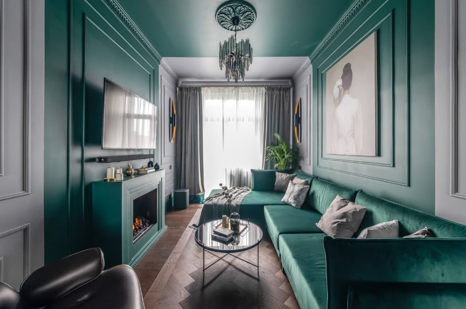 Если говорить о других вариациях цветового оформления, то рекомендуем обратить внимание и на холодные оттенки. Синий, фиолетовый или зеленый цвет отлично смотрится в качестве акцента в интерьере современной гостиной. Однако их применение стоит продумать заранее, поскольку в противном случае гостиная может быть лишена атмосферы тепла и уюта