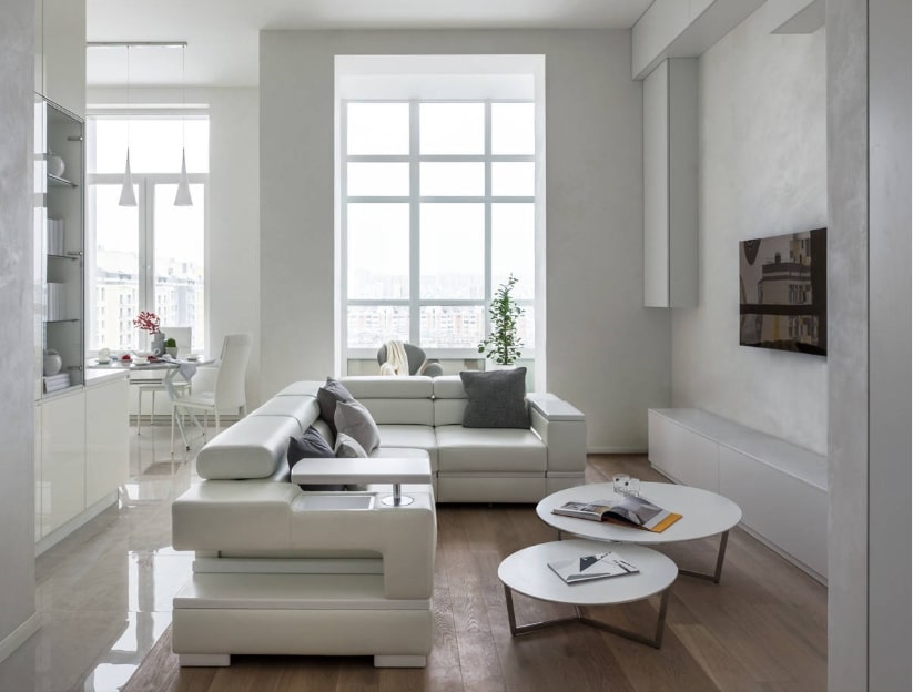 Белый или сочетание синего с белым продолжает оставаться одним из самых трендовых для оформления гостиных. Такие цвета являются наиболее характерными для Скандинавского стиля.