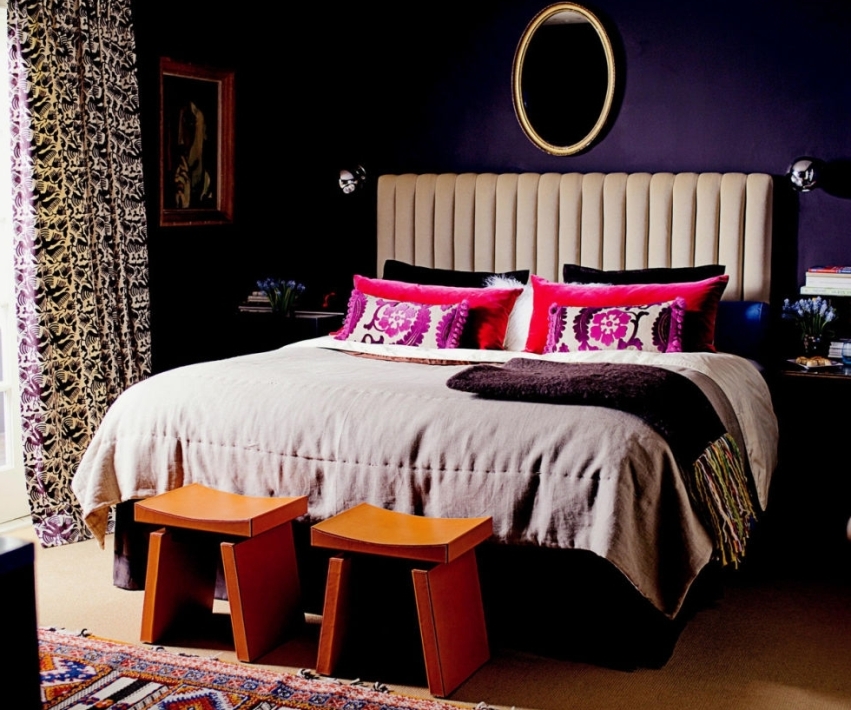 К базовым тонам добавляют немного шоколадного, бордового, золотого. В комнате обязательно размещают кровать с изголовьем, пару тумб. На этом в части меблировки допустимо остановиться. Если площадь позволяет, то устанавливают традиционный шкаф или комод.