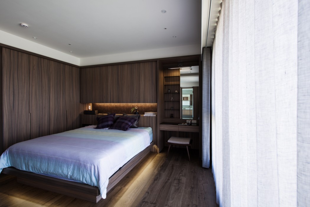 Кстати, изголовье кровати можно обозначить с помощью полки вдоль всей стены, которую использовать вместо прикроватных тумбочек. Подобная конструкция создается из гипсокартона.