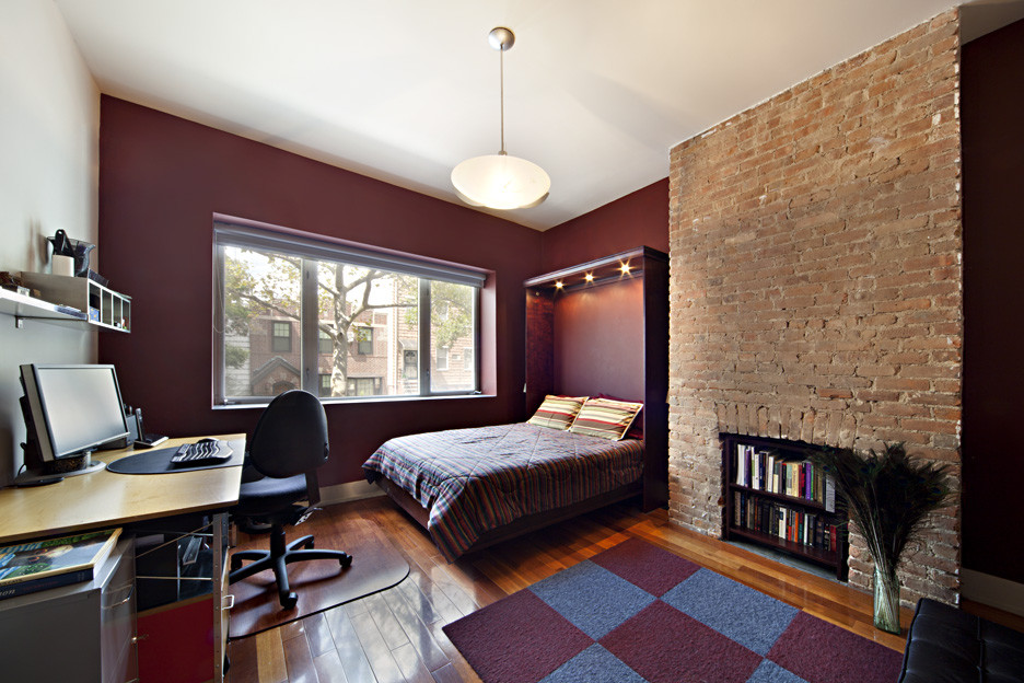 Например, вместо надоевших обоев или штукатурки оставляется только голая кирпичная кладка, бетонные панели или же их имитация. Простая кровать без ножек устанавливается прямо на дощатый пол. Все должно выглядеть так, будто это — временное пристанище свободного художника: никаких декоративных изысков, разве что пара черно-белых принтов, зеркало в тонкой раме и технологичные лампы для освещения.