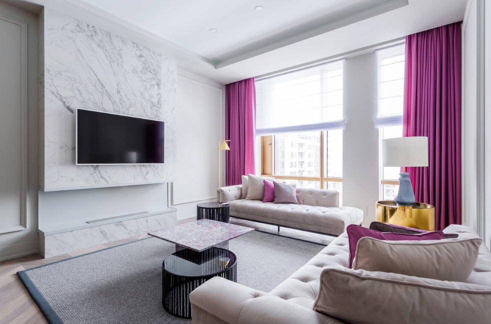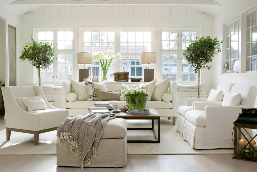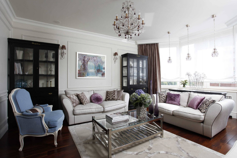 Бежевые гостиные, цвета слоновой кости предпочтительно не смешивать с холодными тонами декора. Светло-серые интерьеры могут быть дополнены синим, зеленым, фиолетовым текстилем.