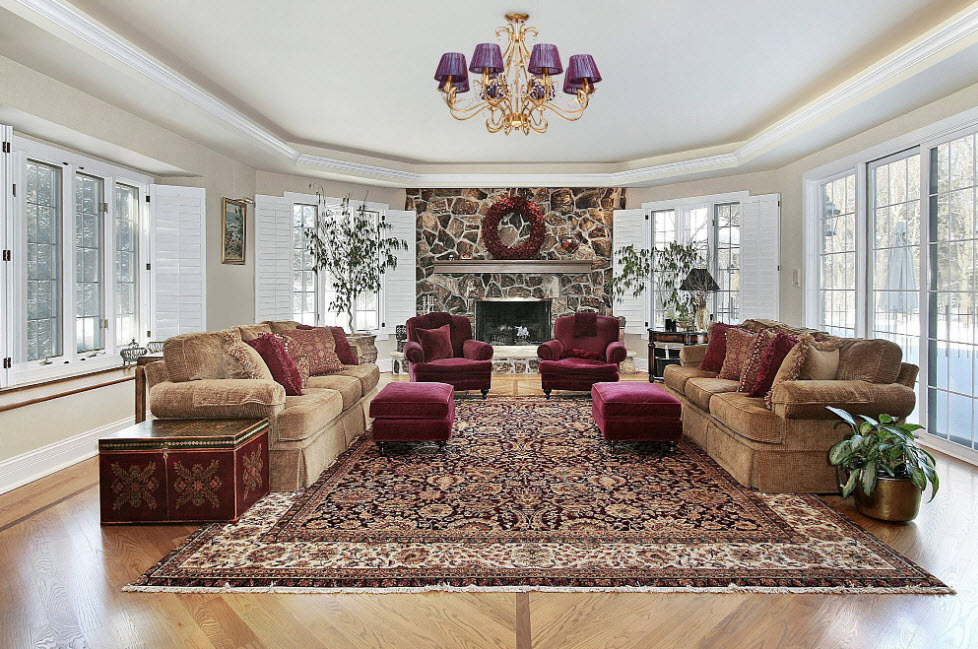 Пол покрывается красным ковролином, поверх которого, для выделения уголка отдыха, может быть положен небольшой коврик или циновка в характерном общему стилю оформления гостиной дизайне.