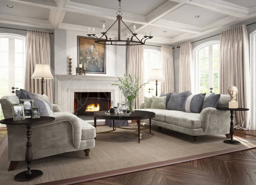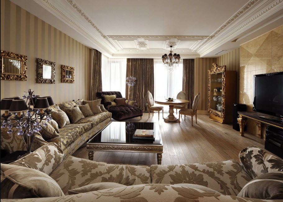 Памятуя о том, что оформление гостиной производится с расчетом ее продолжительной эксплуатации, нет смысла зацикливаться на сложных и помпезных композициях. Они быстро приедаются, теряют актуальность. С завидным постоянством на пике популярности удалось удержаться совсем не ампиру и готике, а:
