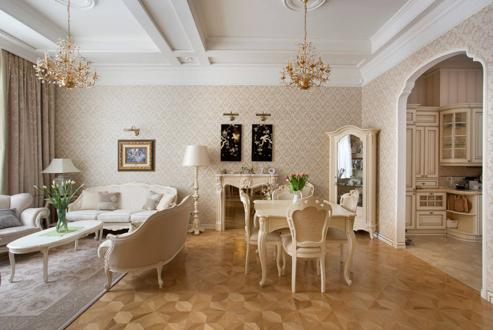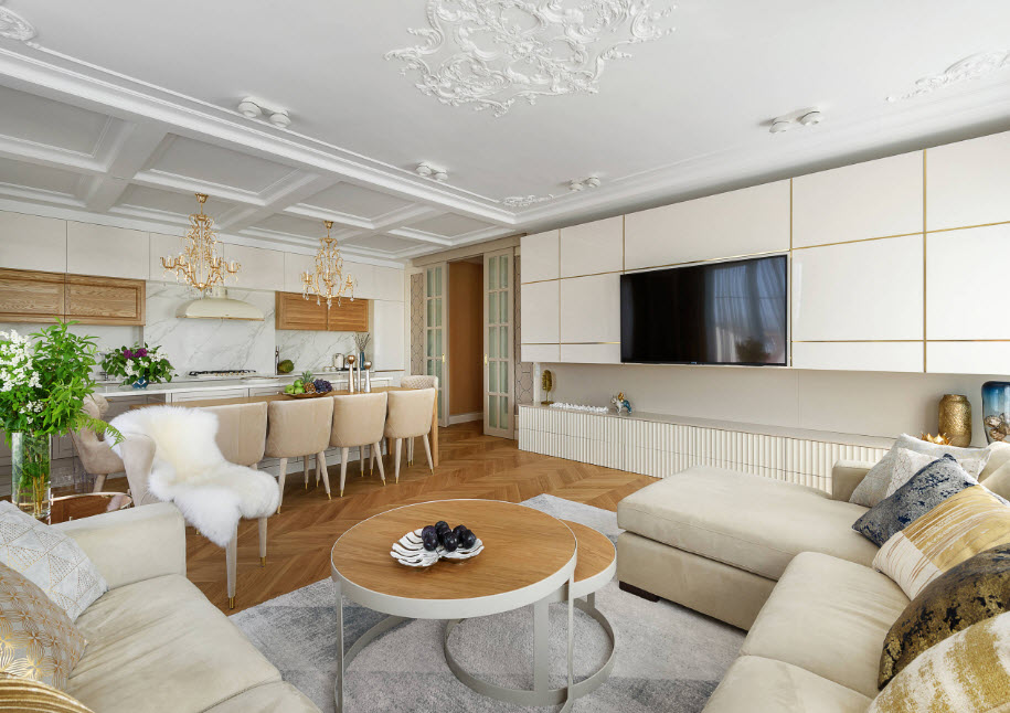 Белая классическая гостиная словно зефирное пирожное состоит из лепнины, фигурных деталей, зеркальных вставок.