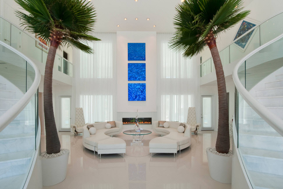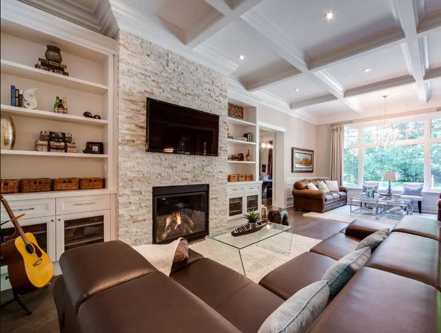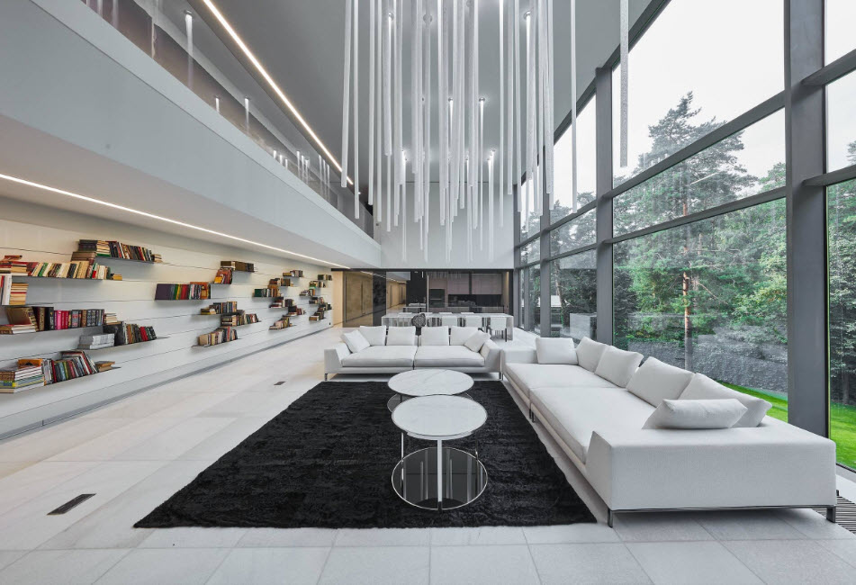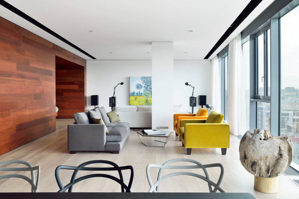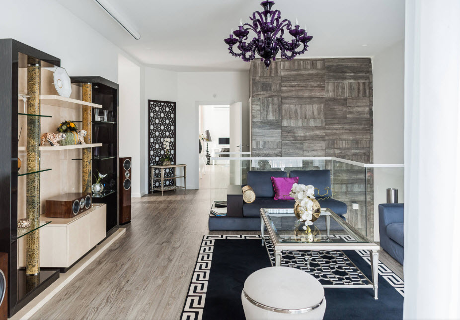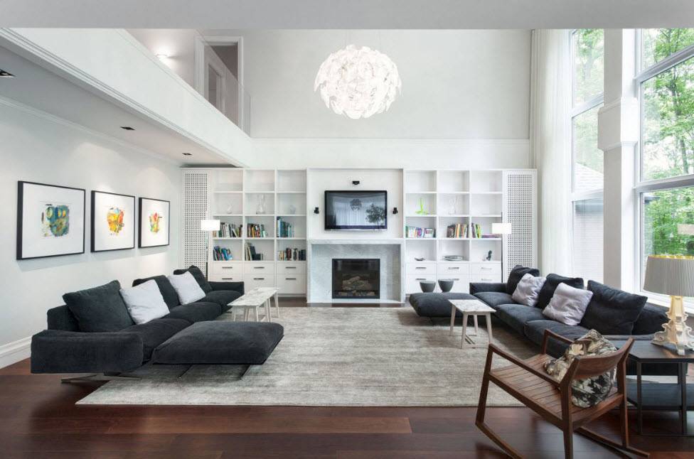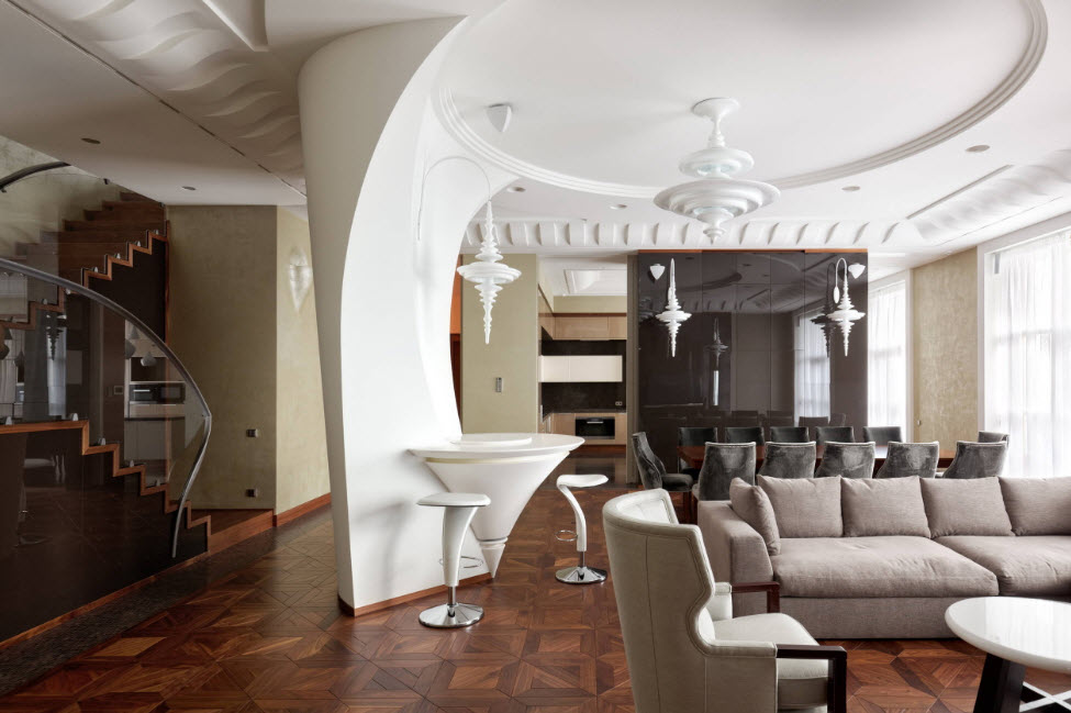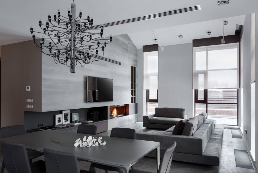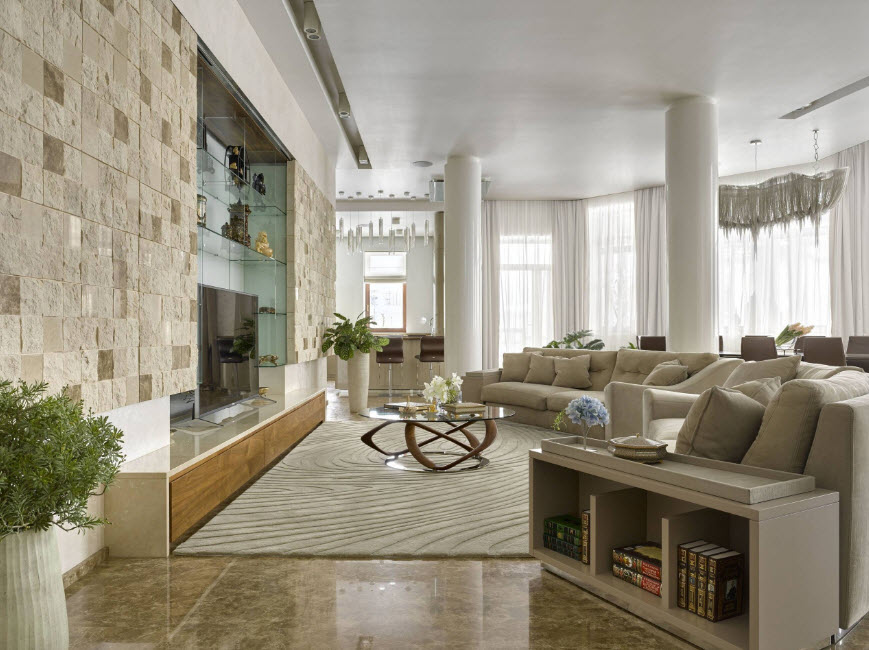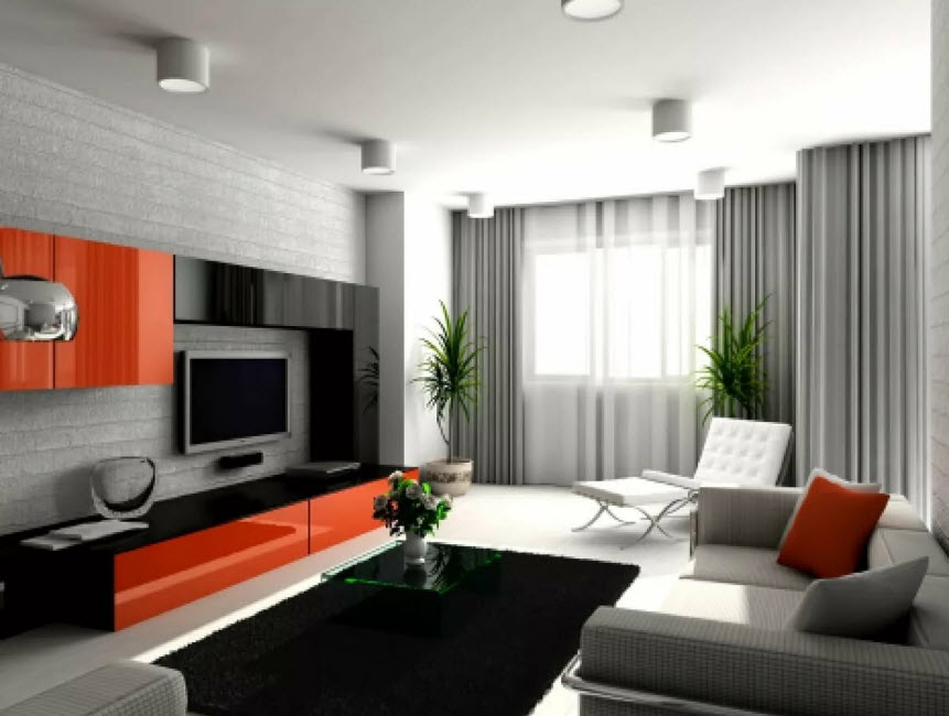 На пол при таком дизайне интерьера гостиной в этом случае кладут темно-серую с глянцевым блеском плитку, а потолок делают в контрастном белом цвете фактурной штукатуркой.