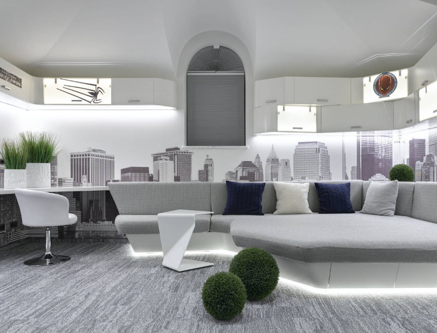 Из элементов обстановки в интерьере гостиной комнаты приоритет остается за приземистой мягкой мебелью в белой обивке, которую отлично дополнит журнальный столик, удерживающий на серых ножках снежно белую столешницу. В изгибе использованной полки достаточно места для размещения масштабной плазменной панели.