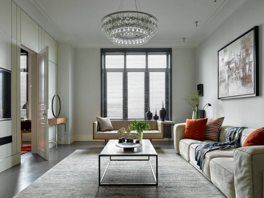Лаконичные светильники идеально впишутся в интерьер гостиной 18 кв.м.