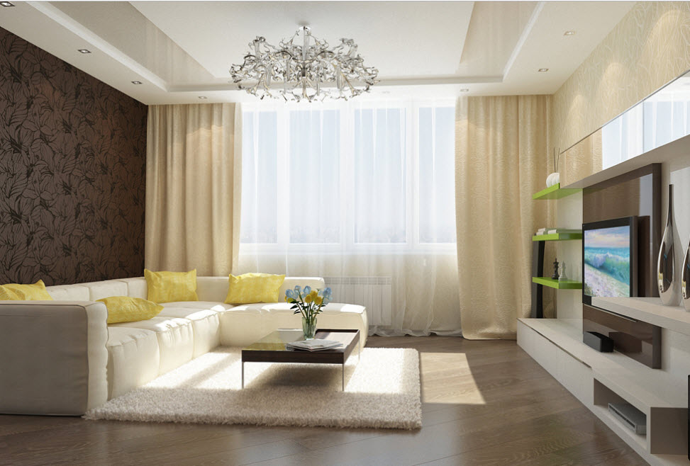Положительным моментом в планировке проходной комнаты является оконно-балконный блок, занимающий практически всю стену. И это при дизайне гостиной нужно непременно обыграть. Декорируйте ее воздушными шторами