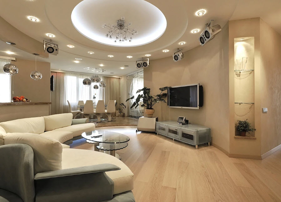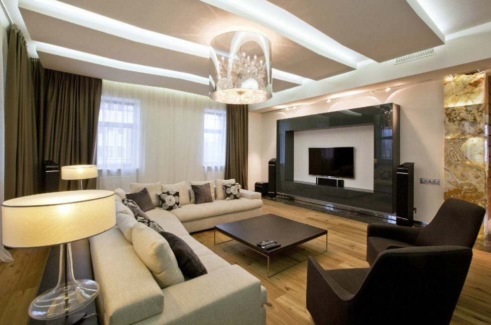 В его оформлении может использоваться абсолютно любая из известных технологий. Потолок может скрываться за натяжными и подвесными конструкциями. Его делают в современном дизайне гостиной ровным и многоярусным. В последнем случае перепады в его поверхности помогут зонировать площадь комнаты. Не ограничена отделка потолка и в цветовом решении.