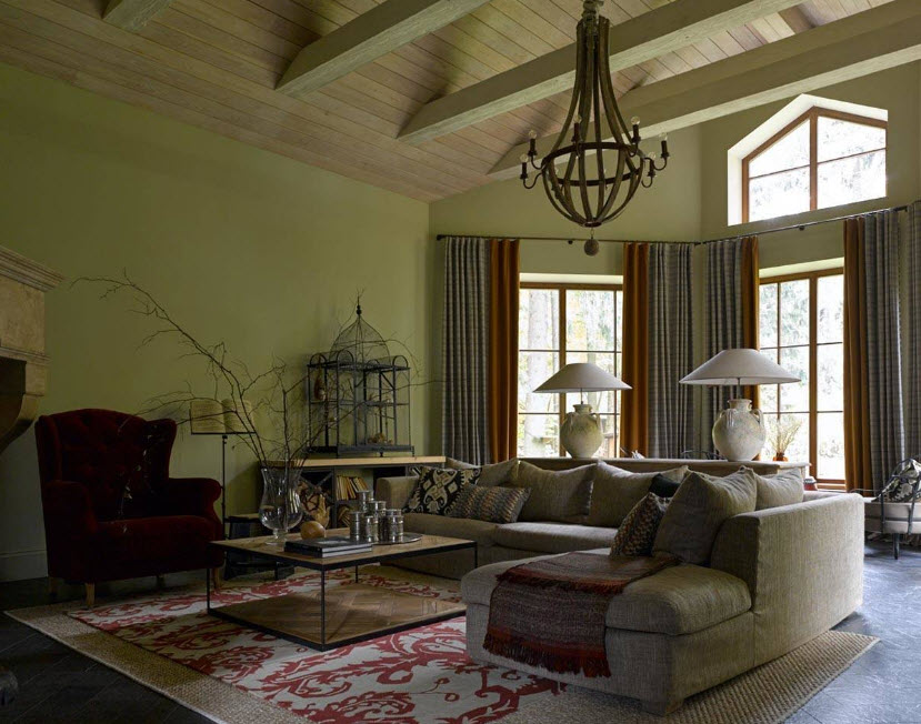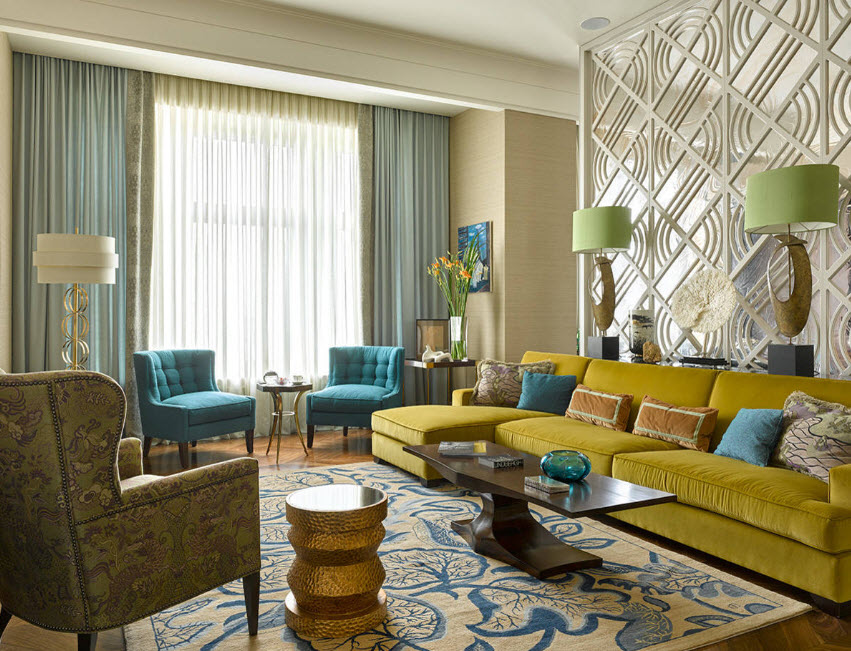 Здесь сочетание штор, покрывал, обивки дивана и кресел, напольных ковров важно для общего впечатления от комнаты