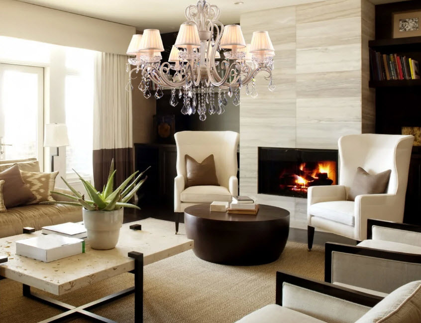 Правильнее будет повесить люстру-таблетку и дополнить верхнее освещение встроенными светильниками. В комплект к ним подбираются бра и торшеры, подходящие к дизайну гостиной комнаты в обще стилистическом решении пространства