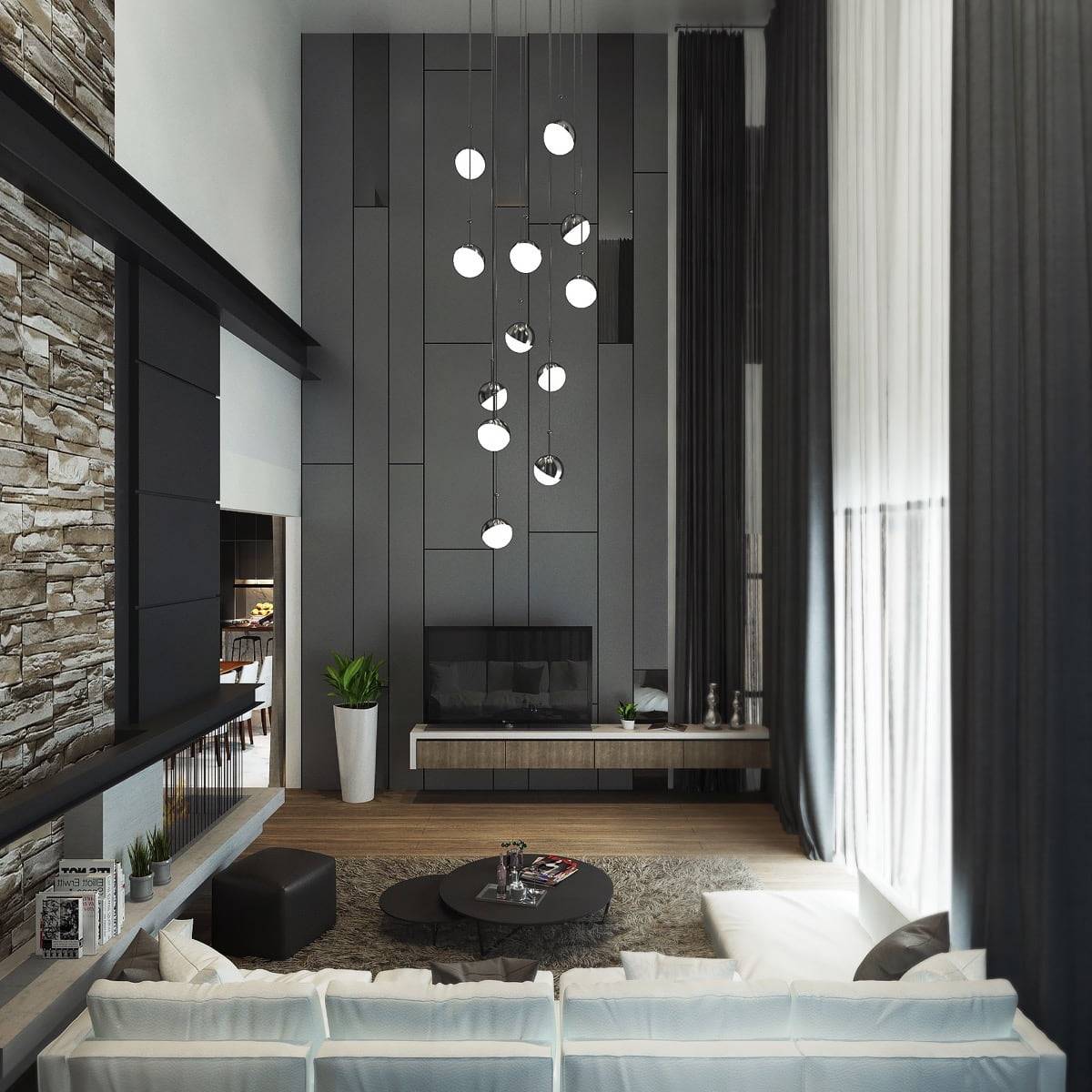 Особенно оригинальный дизайн можно создать в помещениях со вторым светом. Чаще всего в таком пространстве располагают именно гостиную. Высокие потолки, отсутствие перекрытий второго этажа, большие панорамные окна позволяют создать в комнате атмосферу уюта, наполняют помещение светом и воздухом, делая его визуально просторнее. При оформлении нужно учесть принцип соразмерности: предметы мебели должны соответствовать габаритам помещения