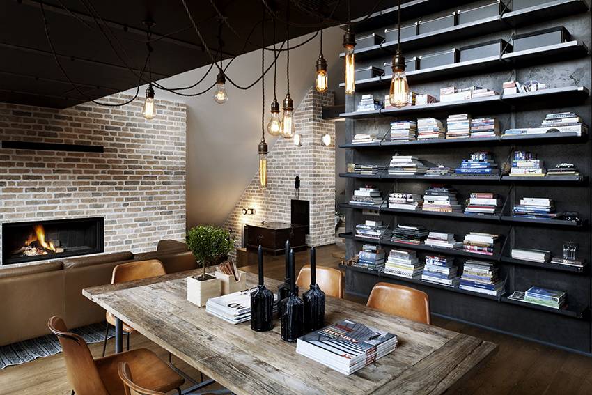 - Обязательно наличие элементов, подчеркивающих индустриальность помещения – труб, проводов, кирпича;