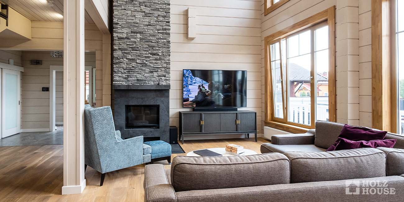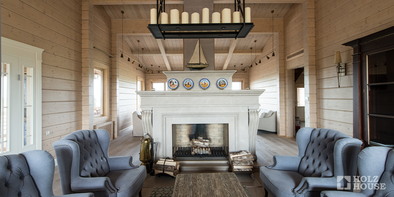Кроме того, важно позаботиться об установке эффективной системы отопления, чтобы равномерно распределять тепло в зимнее время года. В просторных помещениях часто устанавливают массивные камины, располагая перед ними большие мягкие диваны
