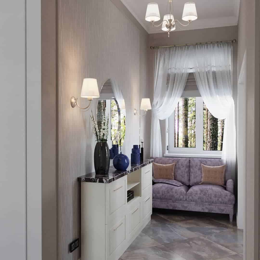 В качестве альтернативы можно предложить использование прихожей в качестве фойе – прекрасно декорированного, свободного от мебели пространства. Отметим, что такой дизайн предполагает наличие гардеробной.