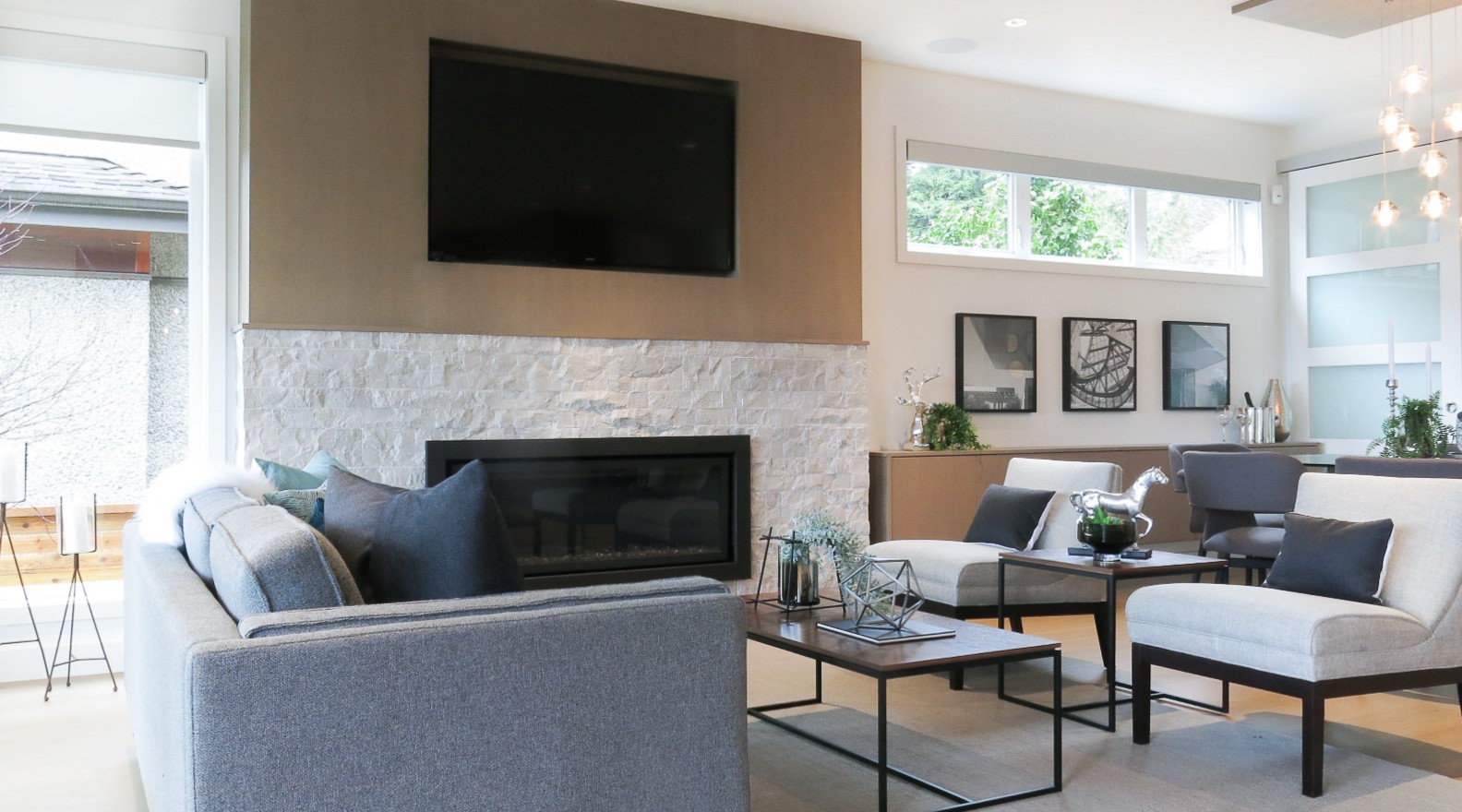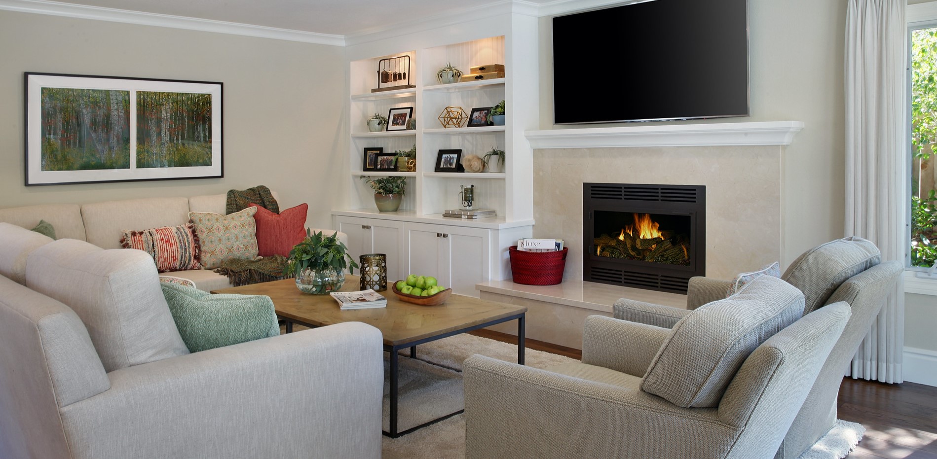Белоснежные оттенки в отделке стен, потолка и центрального элемента прекрасно гармонируют со светлой древесиной напольного покрытия и нейтральными цветами обивки мебели. Лишь темный цвет светильников и рамок для картин выступает контрастом в этой светлой гостиной.