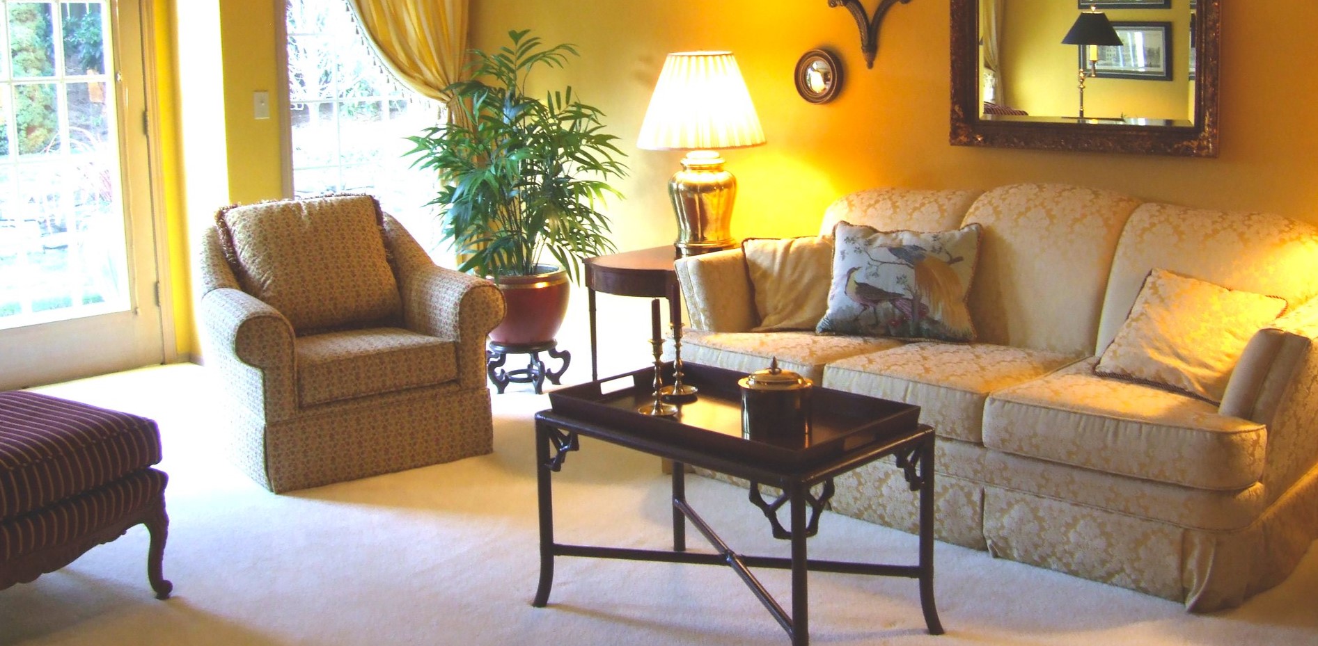 Для гостиной в современном английском стиле рекомендуется выбрать однотонный ковер.