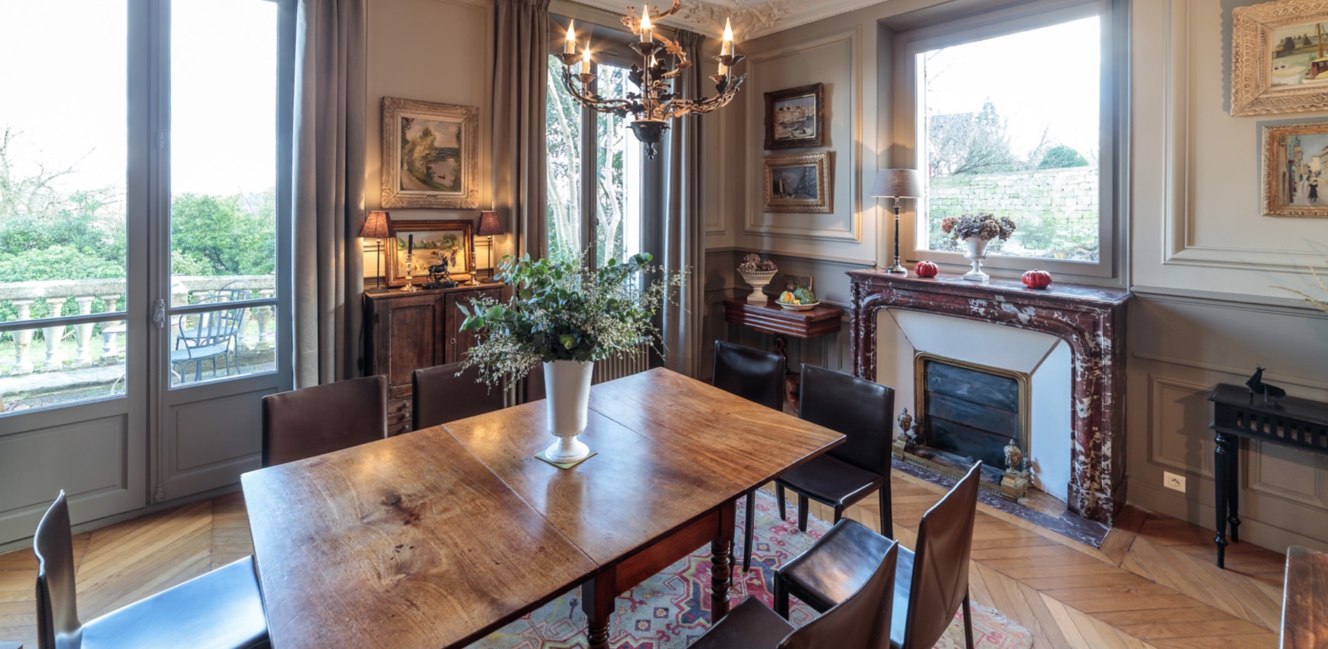Обшарпанная мебель придает квартире нотку парижского очарования. Углубления для книжных шкафов изначально использовались для дверных проемов. Цвет шкафов соответствует цвету деревянной отделки всей квартиры.