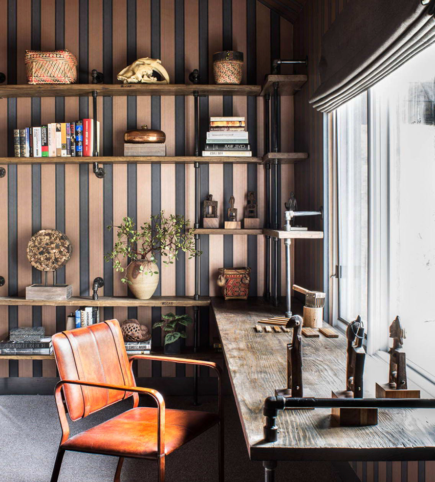 В декоре популярны классические старинные аксессуары: сундуки, глобусы, чучела, состаренные географические карты вместо картин. Если позволяет пространство и планировка, идеально впишется камин или классическая дровяная печь.