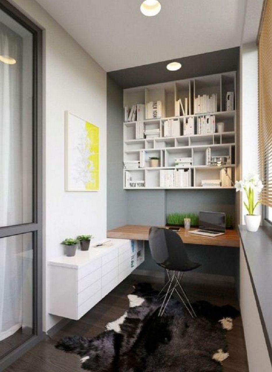 Разместить на маленьком балконе можно и рабочее место (вряд ли его из-за миниатюрных размеров стоит называть кабинетом). Однако плюсов много: никто не мешает работать (мы ведь помним, что крошечные балконы бывают в маленьких квартирах, где место для кабинета не найдешь), отличное естественное освещение, возможность все организовать «под себя». Осталось сделать столик, повесить полки и провести электричество.