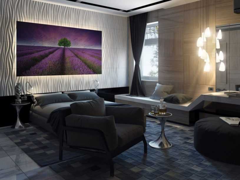 - Спальня. Интерьеры в романтическом, индустриальном или этническом стиле, с цветочными акцентами, в стиле светлого лофта или классики, с акцентной стеной, в морском стиле.