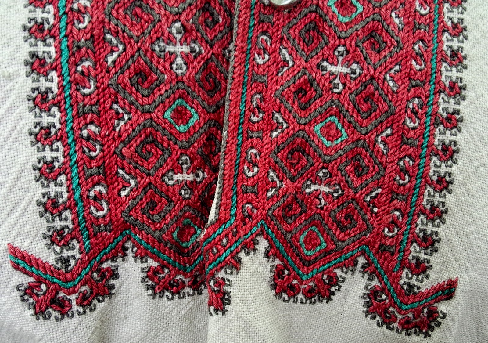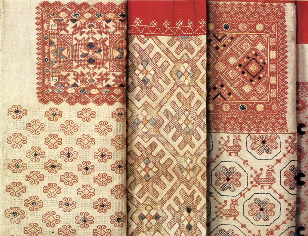 При этом, главной геометрической формой был ромб либо квадрат. Они вышивались с выступами по углам, диагоналями, спиралями и т.п. Фигуры расставлялись друг за другом, расшивались двойным крестиком, поддевчатым швом, гладью, косой стежкой. А в качестве материала использовались шелковые нити.
