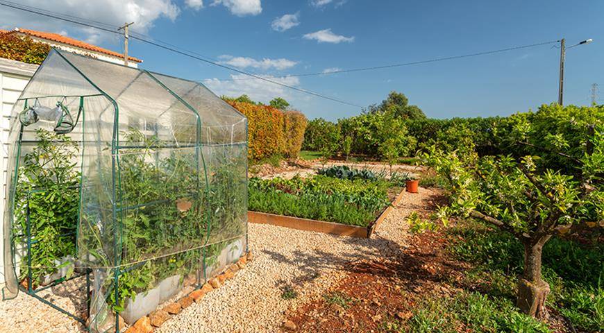 Вы получите большое помещение, которое будет защищать посадки от любой погоды. Материал для него можно выбрать на ваше усмотрение: либо ограничиться просто пленкой, либо задействовать поликарбонат.