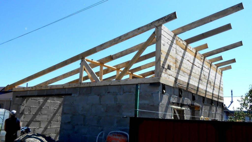 А вот так выглядел каркас односкатной крыши под профнастил. Всё из той же доски сечением 100×50 мм. Если хотите повторить мой опыт – этим материалом придётся запастись в избытке.
