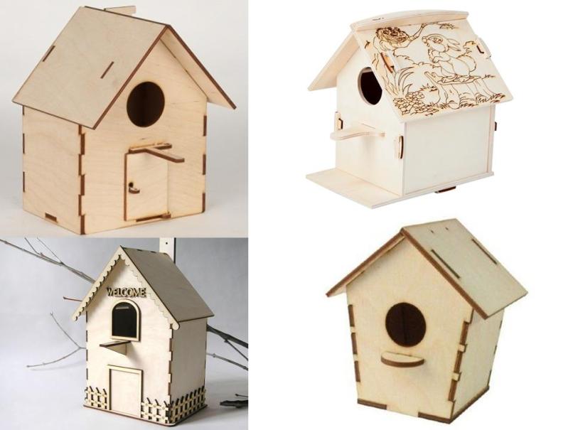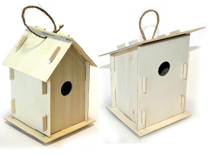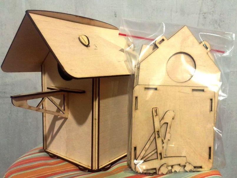 Перед Вами фабричный набор для сборки птичьего домика. Главные его достоинства — интересное оформление и высокая скорость сборки. Тонкая фанера имеет пониженную тепло- и звукоизоляцию. Такой домик для птичек лучше использовать в теплых регионах, и он не прослужит долго.