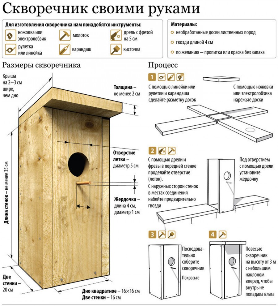 Скворцы, как и все воробьинообразные – птицы небольшие (в длину они вырастают не более 20 см), поэтому и скворечник лучше сделать средних размеров: высотой до 40 см, а глубиной и шириной – до 15 см. В таком жилище смогут вырасти 3–4 птенца, и в таком количестве их легко выкормить скворцу-папе и скворчихе-маме. Если вы решили не мелочиться и построить скворечник побольше, скорее всего, это благое намерение добром не кончится – не исключено, что выжившее потомство вырастет хилым, а на сам скворечник позарятся более крупные соседи, например, совы или сычи.