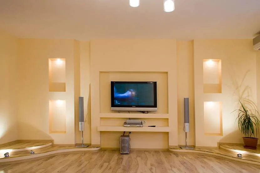 - Технологичность и простота обработки. Из гипсокартонных листов своими руками можно сконструировать разнообразные декоративные ниши и другие элементы интерьера, имеющие разные геометрические фигуры и формы. Система их крепежа настолько отлажена, что монтаж может осуществлять даже непрофессионал.
