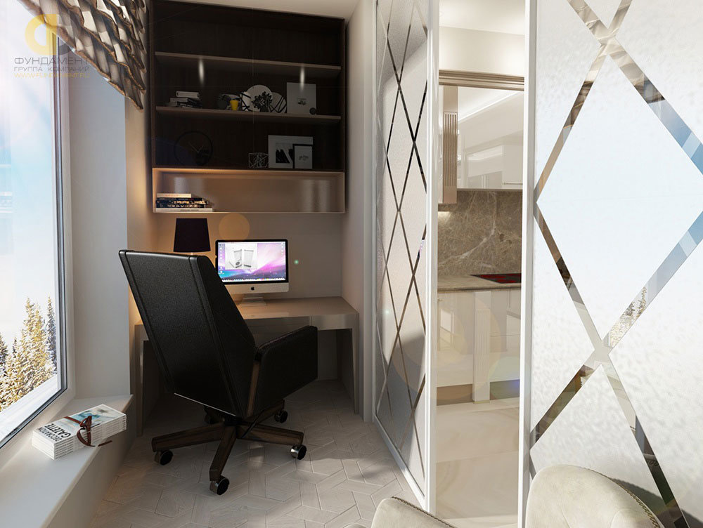 Организуя рабочий кабинет на балконе, нужно как следует продумать его дизайн. Можно использовать способ деления пространства на зоны.