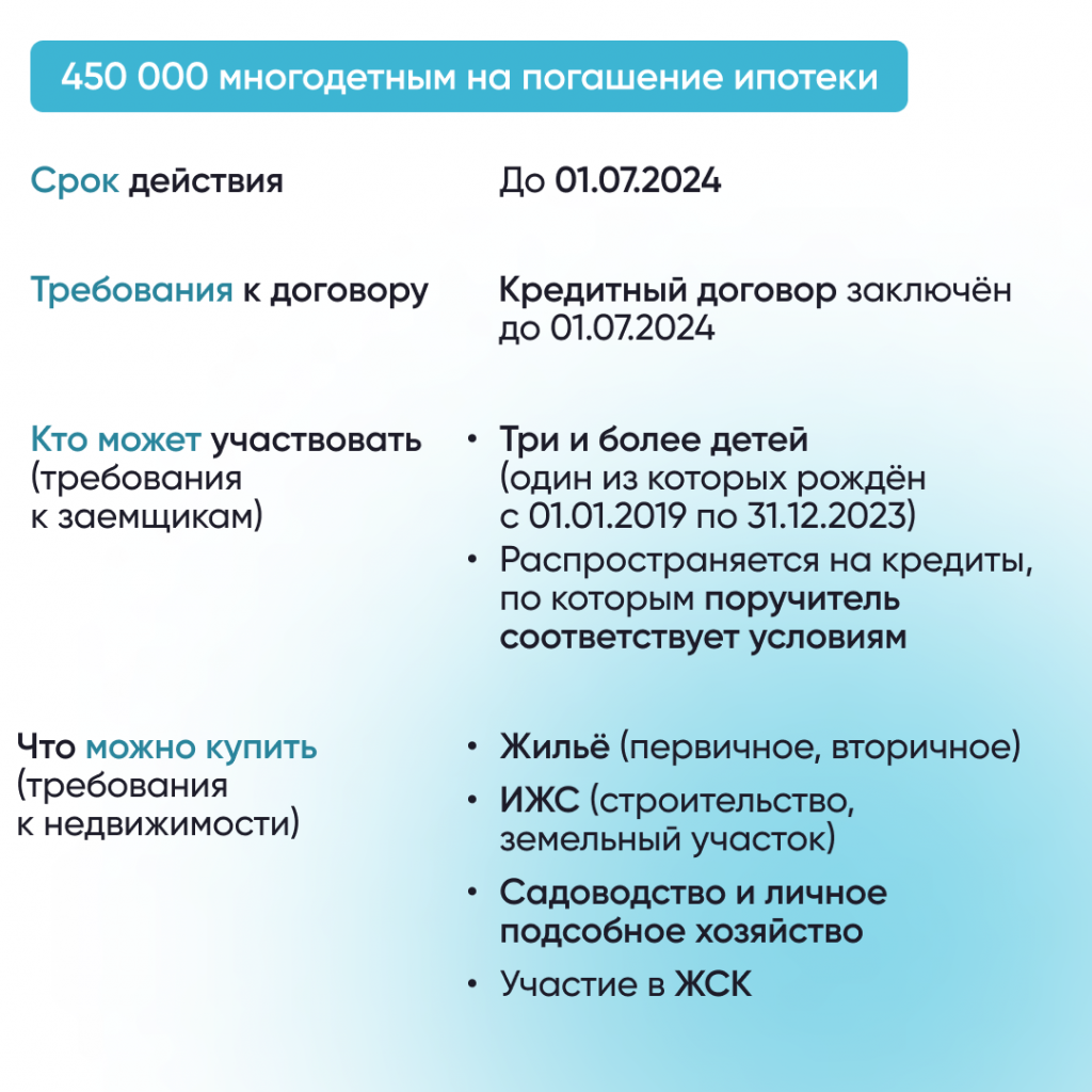 Доступно для семей с тремя и более детьми, третий из которых родился с начала 2019 до конца 2022 года. Государство выделяет 450000 руб., чтобы погасить существующий долг. Если остаток долга меньше этой суммы, средствами из бюджета погасят кредит полностью, но разницу на руки не выдадут. Участвовать можно один раз.
