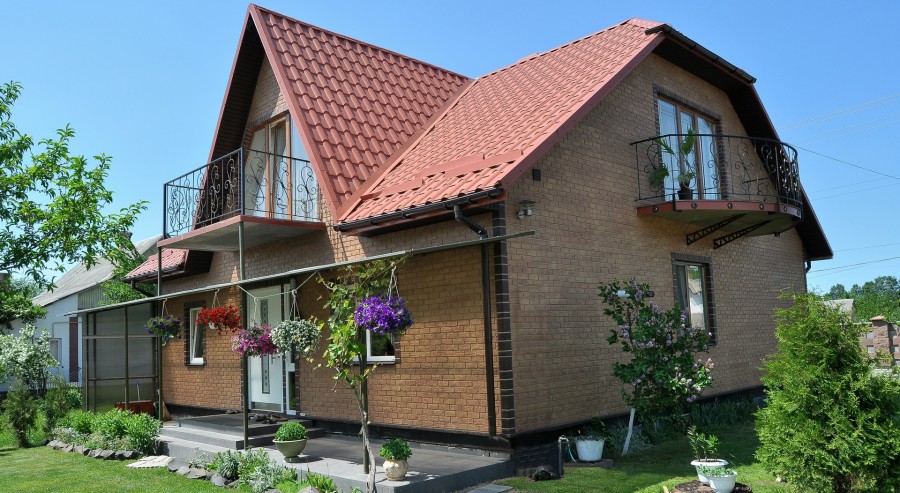 Загородный дом с применением различных сочетаний клинкерной плитки – отлично смотрится с крышей из металлочерепицы
