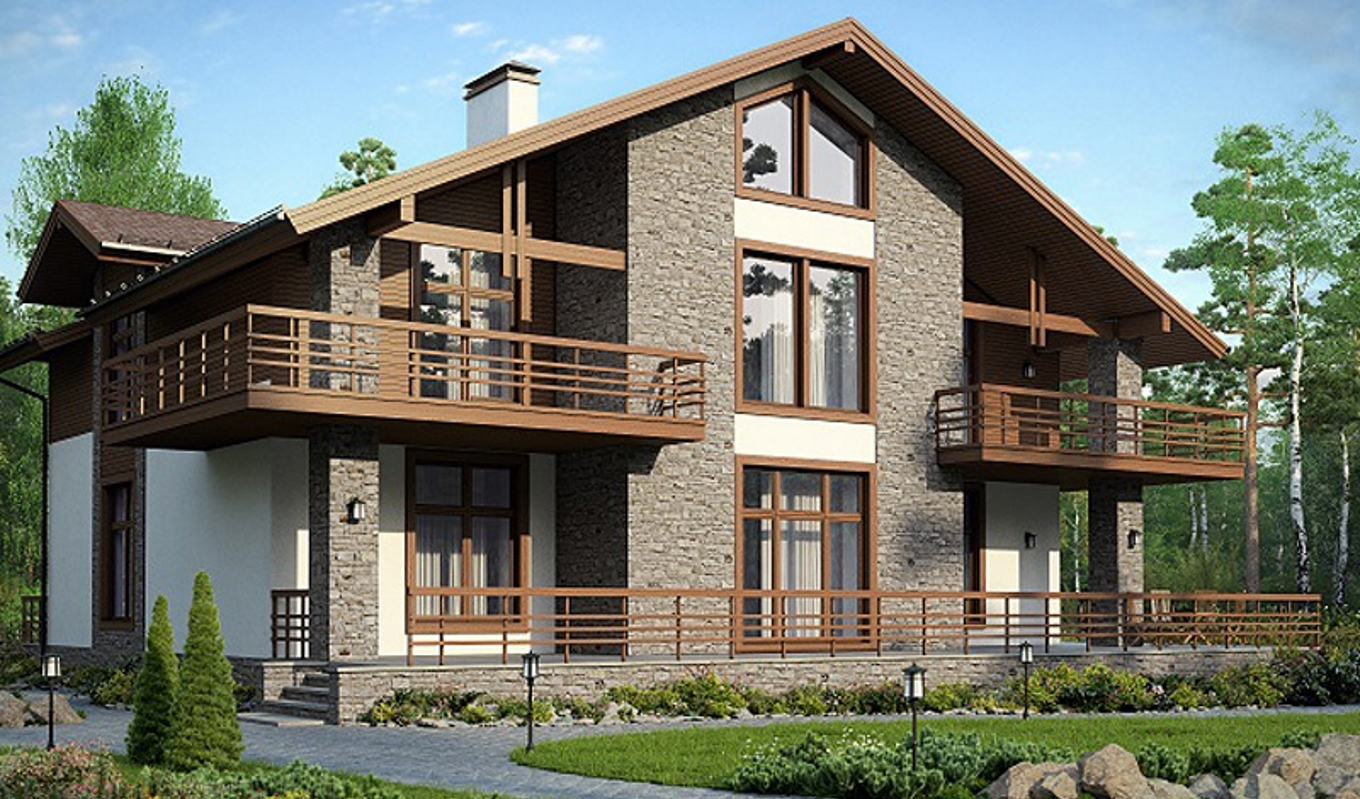 Дом, в котором используют дерево, натуральный камень и декоративную штукатурку