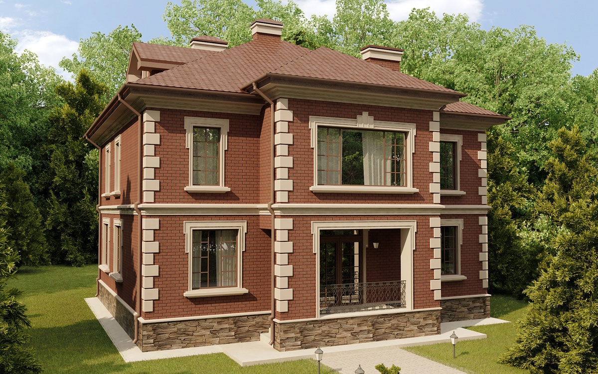 Более «монументальным» для частных домов является использование облицовочного кирпича, клинкерной плитки и натурального камня. Фасад будет прочным и долговечным при любом климате. Но данный вид отделки является самым дорогим и трудоёмким.