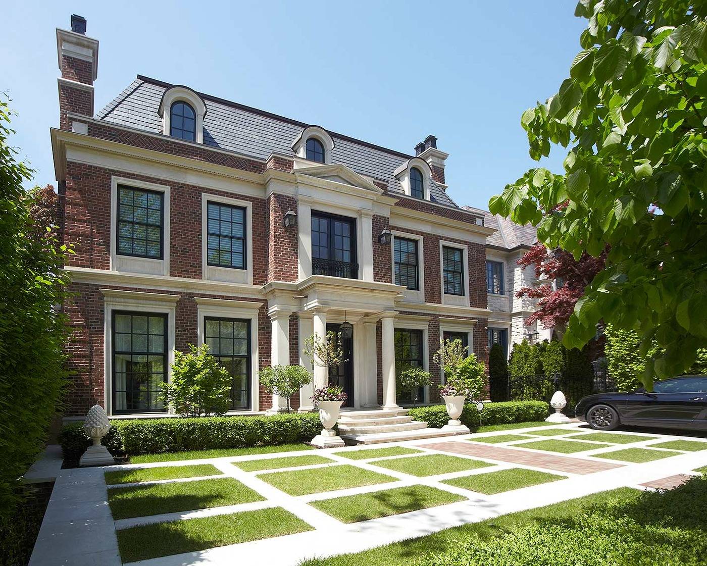 Дизайн фасада двухэтажного дома в колониальном стиле можно гармонично дополнить такими элементами экстерьера, как ажурные заборы и подвесные светильники.