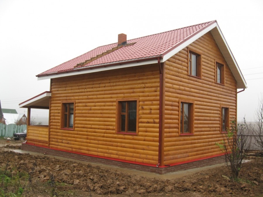 Деревянный блок хаус внешне напоминает большие древесные плиты, которые после фиксации напоминают деревянный брус. Фиксируют их на металлический каркас, который предварительно утепляют слоем гидроизоляции. На фото фасада дома представлен готовый вариант облицовки жилого здания.