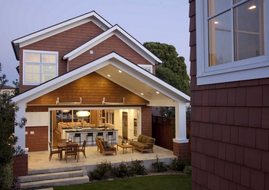 Оформление дизайна фасада дома в стиле кантри и модерна можно улучшить, используя комбинацию двух цветовых решений для облицовки верхнего этажа. В сочетании с нависающей частью крыши это решение создает визуальный эффект затемнения части фасада.