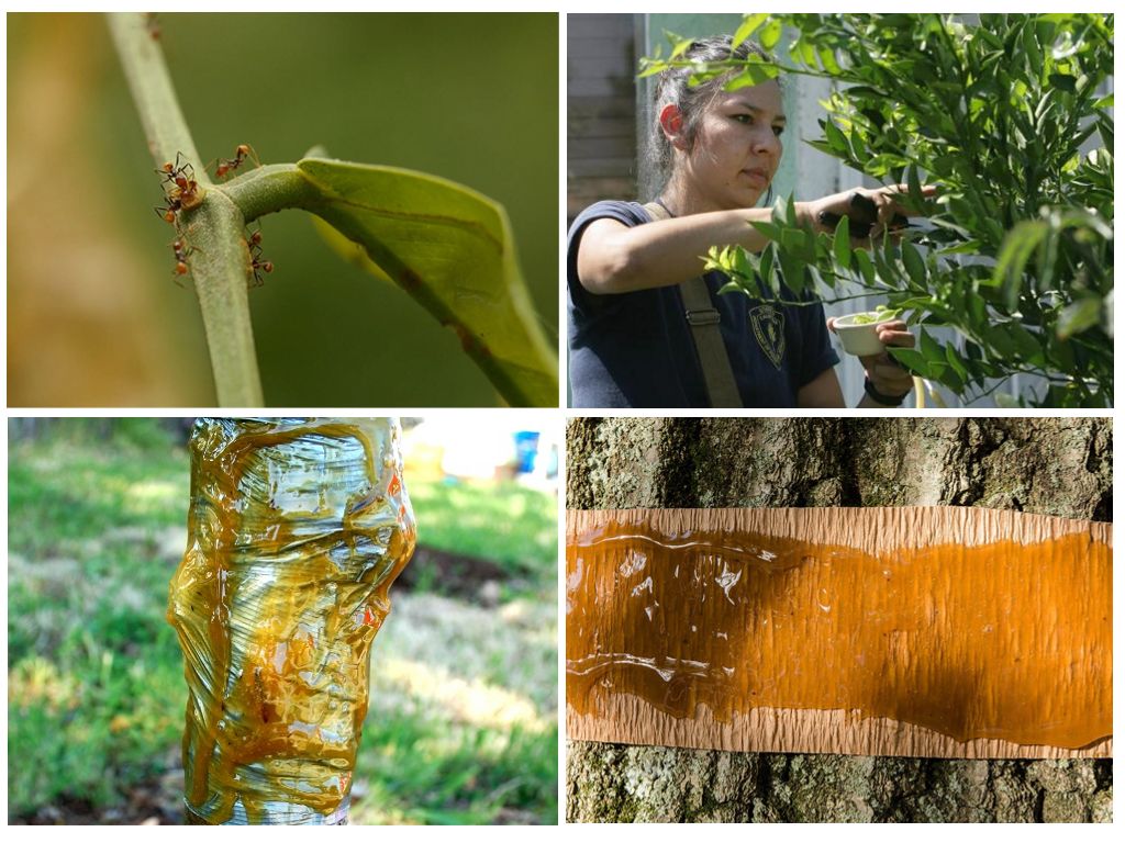 - Рекомендовано использовать смесь глины и опилок. Данным средством нужно намазать ствол дерева на высоте 30 см от грунта. На замазанный участок нужно прикрепить кусок прочного материала и закрепить его веревкой. Таким образом у вас получится «юбка» на стволе дерева, которая будет препятствовать муравьям попадать к плодам.