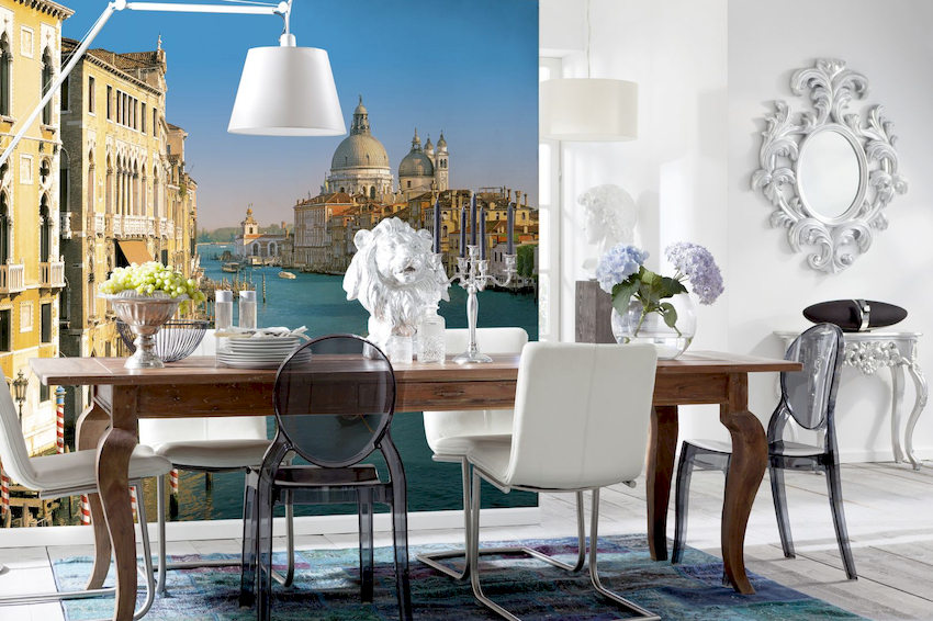 4. Виниловые – идеально смотрятся на стене, но очень плотные. Поэтому такой вид обоев сложно наклеивать. Виниловые фотообои устойчивы к истиранию, влагостойкие и максимально практичные. Клей наносится на полотно и оставляется на 5-10 минут для пропитки. Также он наносится на поверхность стены. Приклеивать фотообои из винила необходимо с помощью резинового шпателя или куска мягкой ткани. Выравнивать нужно резиновым валиком. Кстати, полотна клеятся исключительно встык, так как они достаточно толстые.