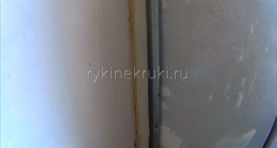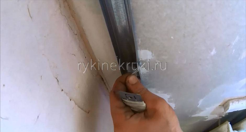 Сейчас все профили, предшествующие первому профилю придавлены к стене. Начинаем выставление первого профиля. Профиль не должен ни в коем случае отгибать нитку: