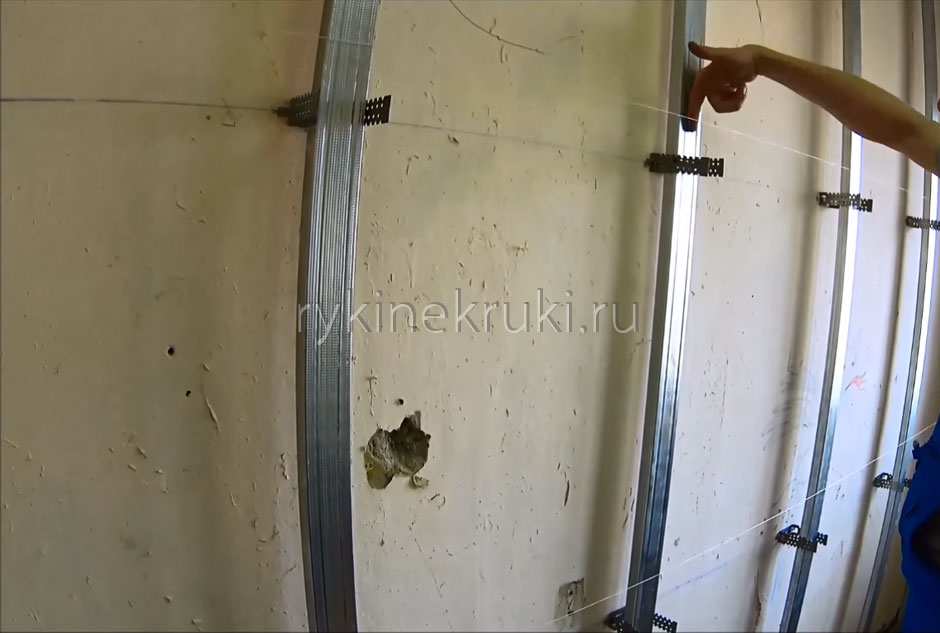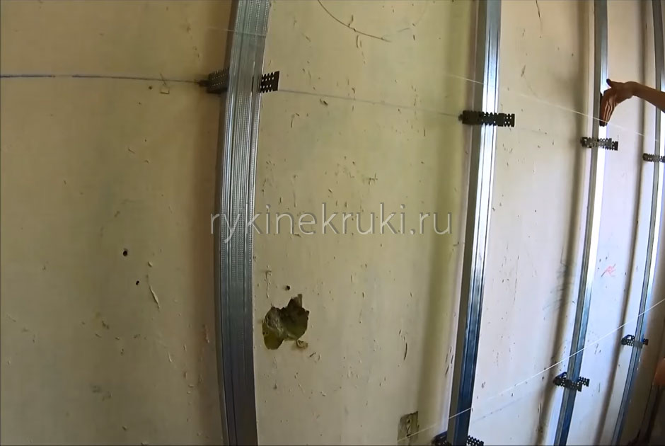 По завершении монтажа нитки снимаются. А выступающие концы П-образных подвесов загибаются внутрь, но это при условии, что стена не будет утепляться. Если будет укладываться утеплитель между профилями, то загибать подвесы рано — они еще пригодятся.